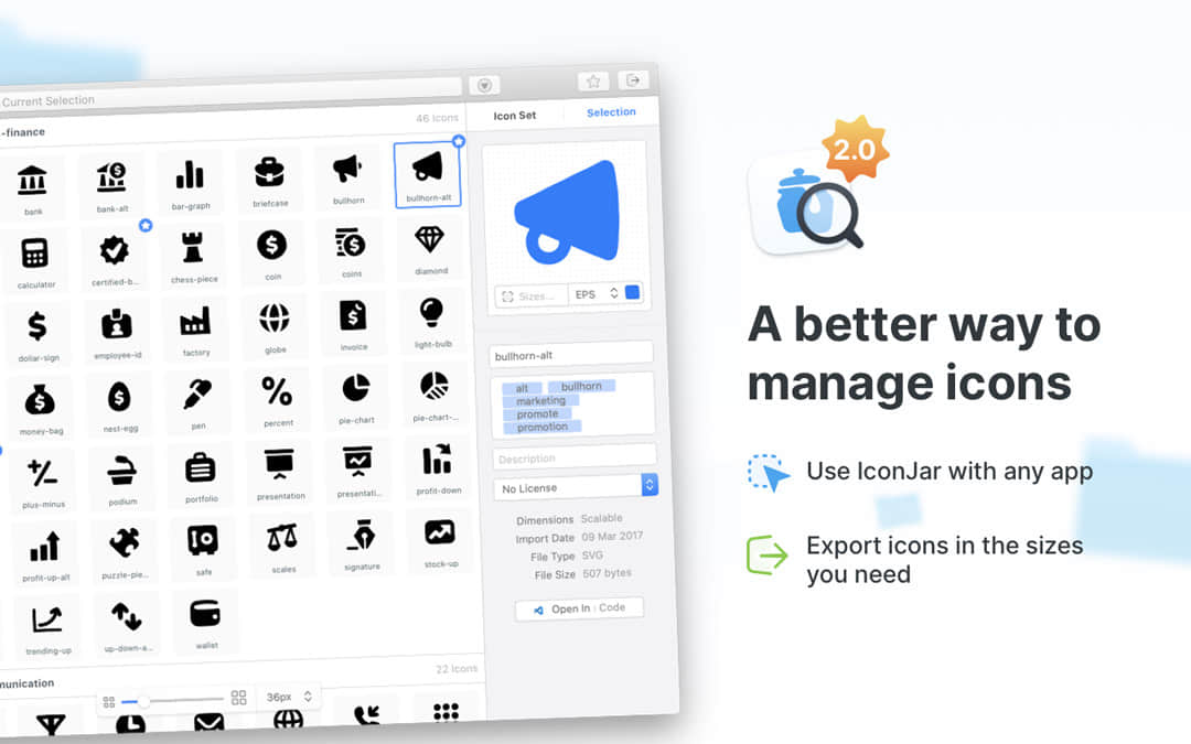 IconJar 是一个可以帮助设计师搜索、收集、管理的素材工具,可以极大的提高设计师们的素材库使用效率,减少寻找有效素材的时间,提高工作效率