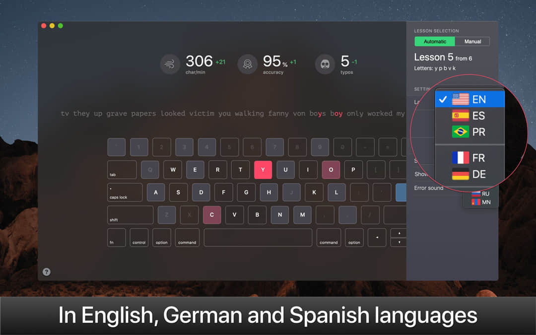 KeyKey Typing Tutor 是一款 Mac OS X 上优秀的键盘打字练习工具,可以让我们快速的掌握高效率正确的键盘打字方式,软件界面也很精美!