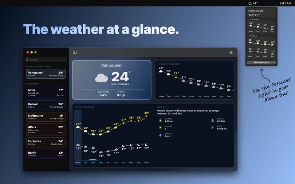 Mercury Weather 是一款兼具美观与精准的天气应用,通过图表、菜单栏和小组件,让你快速、直观地掌握天气变化。