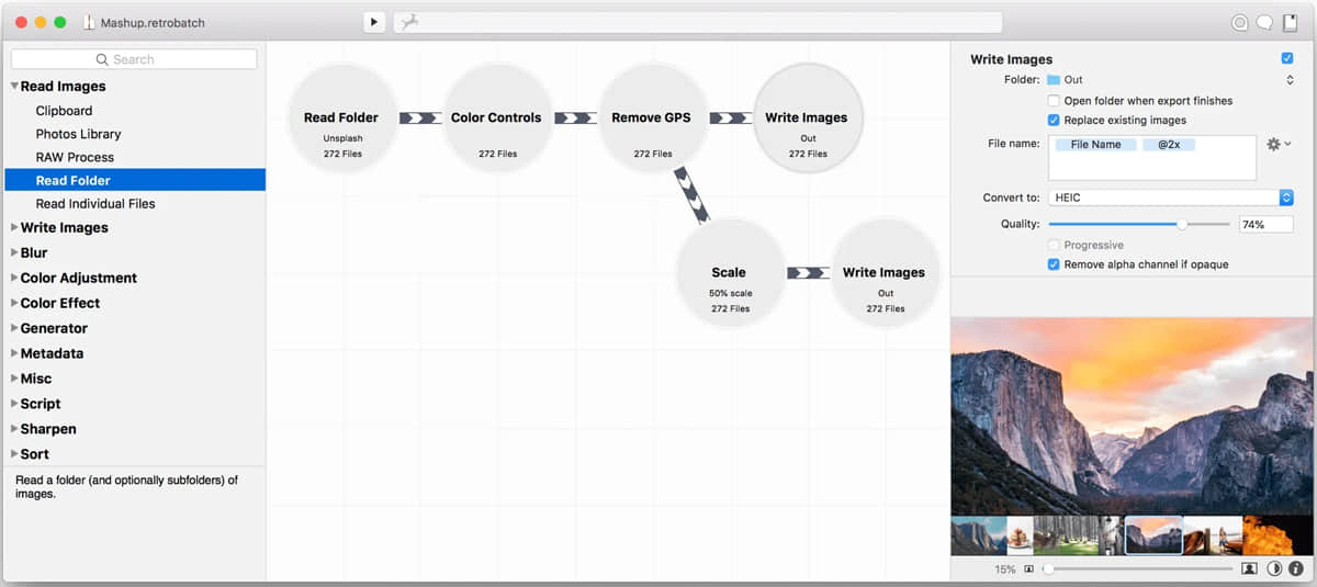 Retrobatch 由用户自由创建 Workflow 来实现相应的功能,这些 Workflow 能取代大量的重复劳动,可以说是提高生产力的利器。