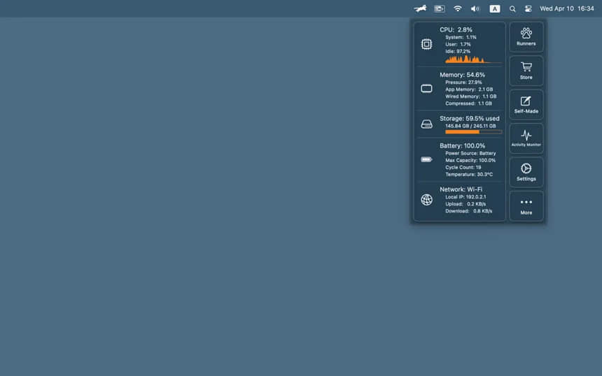 StatsBar 是一款 Mac 上的系统监控工具,可以实时监控系统的 CPU 使用率、内存使用率、硬盘使用、网速、电池等信息,还可以释放内存、监控网速、电池健康状态等