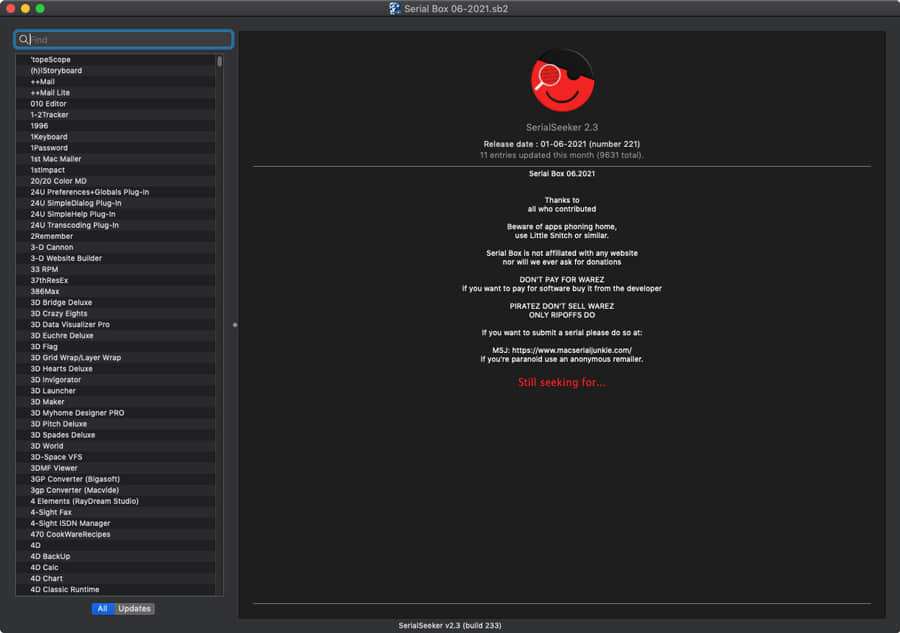Serial Box是一个序列号神器,有国外的网友收集网络上流传的Mac软件序列号让后将其整合到一起,给其他网友使用的