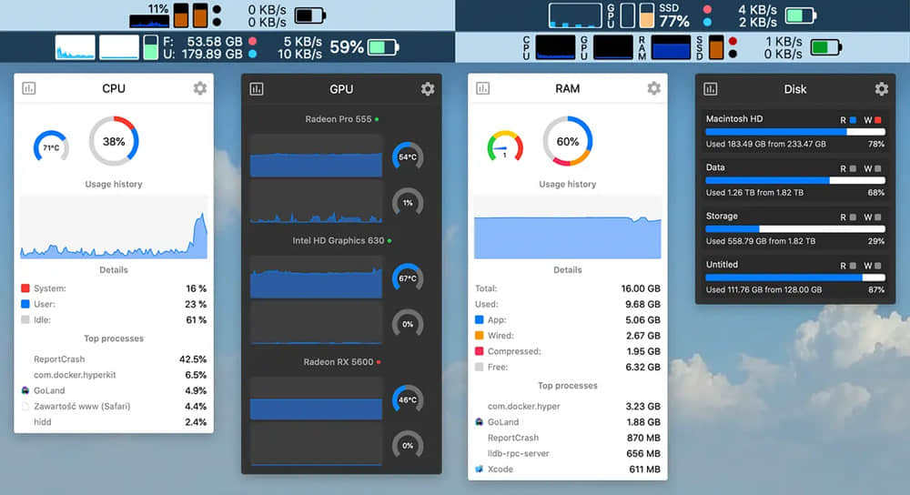 iStat Menus是Mac上最优秀的系统监控工具,能够在系统菜单栏实时监控CPU、GPU、内存、硬盘、网络、温度、电池以及系统时间等,稳定且占用资源少,可以说是装机必备的软件。